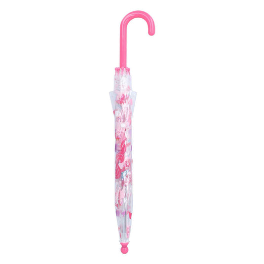 Transparante kinderparaplu met Minnie Mouse print en roze details. Gemaakt van kunststof en metaal. Lengte 66 cm, diameter 69 cm. Geschikt vanaf 3 jaar.
