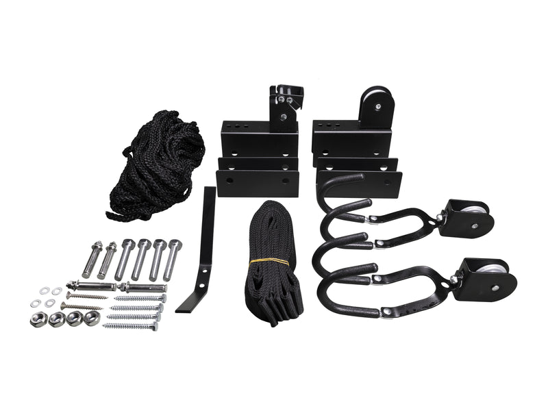 Met de extra sterke Simson (E)-bike lift en ophangsysteem kan je eenvoudig thuis een fietsreparatie uitvoeren of een (E)-bike opbergen. De fiets kan op verschillende hoogtes worden gehangen door middel van katrollen. De TÜV gekeurde Simson (E)-bike lift en ophangsysteem kan maximaal 54 kilo dragen en op 3 meter hoog worden gehangen. Let hierbij op dat het plafond waar de lift aan gemonteerd wordt dit ook kan dragen. Bij de Simson (E)-bike lift en ophangsysteem worden ook handige draagbanden meegeleverd. Hiermee kan bijvoorbeeld een dakkoffer of surfplank snel en makkelijk worden opgeborgen.